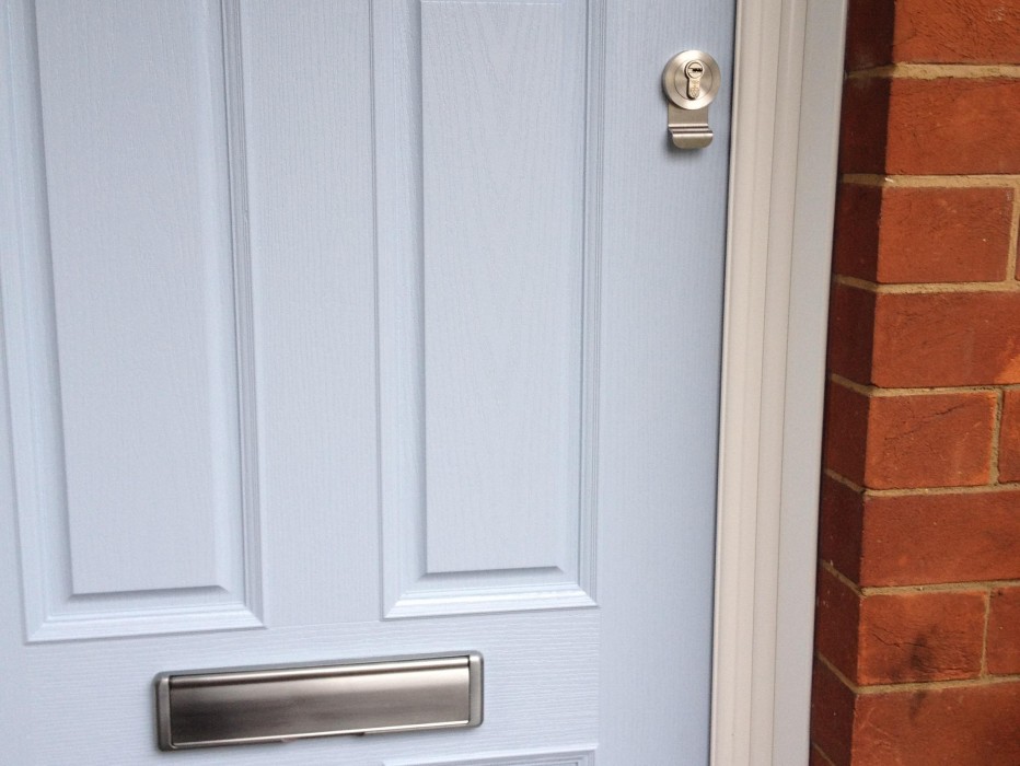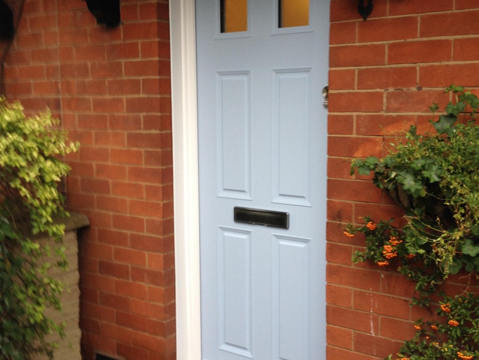 70mm Double rebated Composite Door installed in Porcelain Blue with Satin glazing.